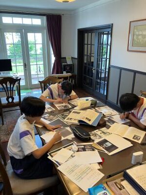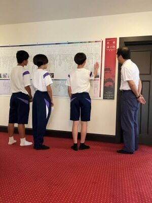 山手台中学校の男子中学生3名は、初めて訪れる高碕記念館で、おじさんスタッフから仕事を教えてもらい、5日間の職場体験に取り組みました。初日は少し緊張気味でしたが、最終日には元気よく発表を聞かせてくれました。3名が仕上げた資料には、高碕さんやヴォーリズさんの功績が分かりやすくまとめられていました。発表の中で、「高碕さんにもっと有名になってほしい」といった意見や、「高碕さんは学校の教科書に載ってもおかしくない人です」との意見が出てきました。ヴォーリズ建築を知り、「建築に興味がわいてきました」との言葉もありました。