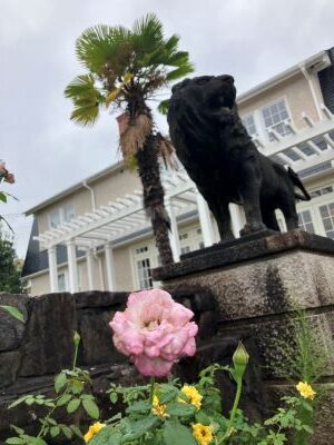 高碕記念館の窓の向こうに、ピンク色の小さなバラが見えます。厳しい夏を乗り越えて、今は静かにひっそりと咲いています。秋バラには癒しの力があるのでしょうか。眺めていると、心がすっと落ち着きます。春のバラのような華やかさはありませんが、秋バラには、やさしく寄り添ってくれるような魅力があります。
