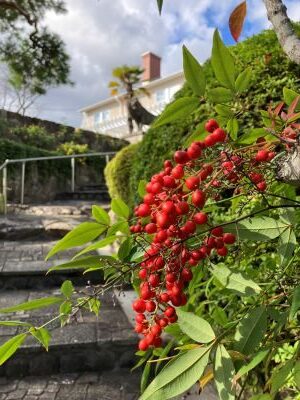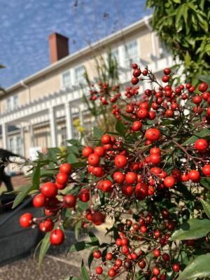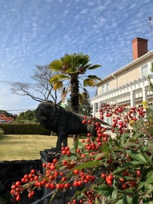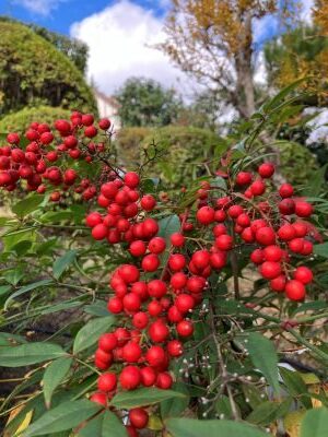 高碕記念館の南天の木は、真っ赤な実をたくさん付けています。南天は中国原産で、日本には平安時代に薬用として入って来たようですが、今ではすっかり日本の文化に根付いている植物です。日本語では、「難を転じる」という語呂合わせから、縁起の良い木として親しまれています。花言葉は、幸せ、良い家族、機知に富むなどです。