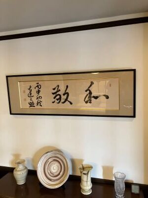 高碕記念館のリビングには、高碕達之助さんご本人揮毫の扁額が掲げられ、「和敬」の二文字が大きく記されています。高碕さんがどのような思いで書かれたのか、私は深く考えることもなく過ごしていましたが、先日ふと手にした書籍の中に、「和敬清寂」の文字を見つけました。そこには、「お互いの個性や違いを尊重し、理解し合い、敬い合うこと」の大切さが説かれていました。高碕さんの人生こそが「和敬」の実践で、世界の要人への細やかな対応や、人々との触れ合いににじむ温かな人柄も、すべてつながっているように思えました。
